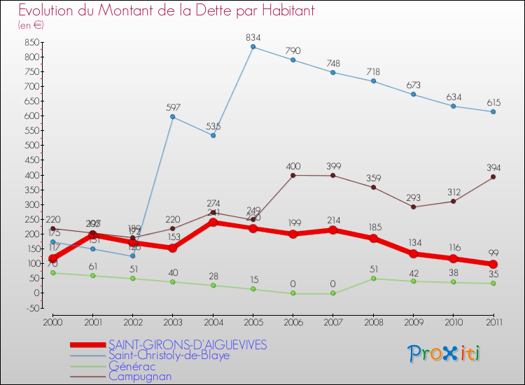 A Saint-Girons-d'Aiguevives, la dette par habitant a donc baissé de 15.38 % entre 2000 et 2011.