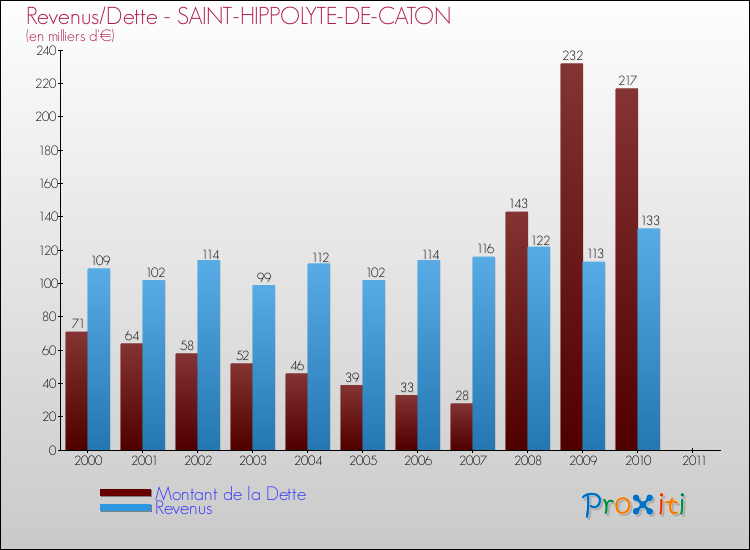 Comparaison Revenus/Dette de Saint-Hippolyte-de-Caton (de 2000 à 2011)