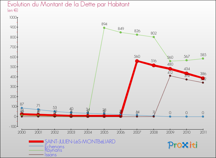 Pendant la même période, les communes françaises similaires à Saint-Julien-lès-Montbéliard, ont vu leur dette par habitant augmenter de 24.08 % en moyenne entre 2000 et 2011.