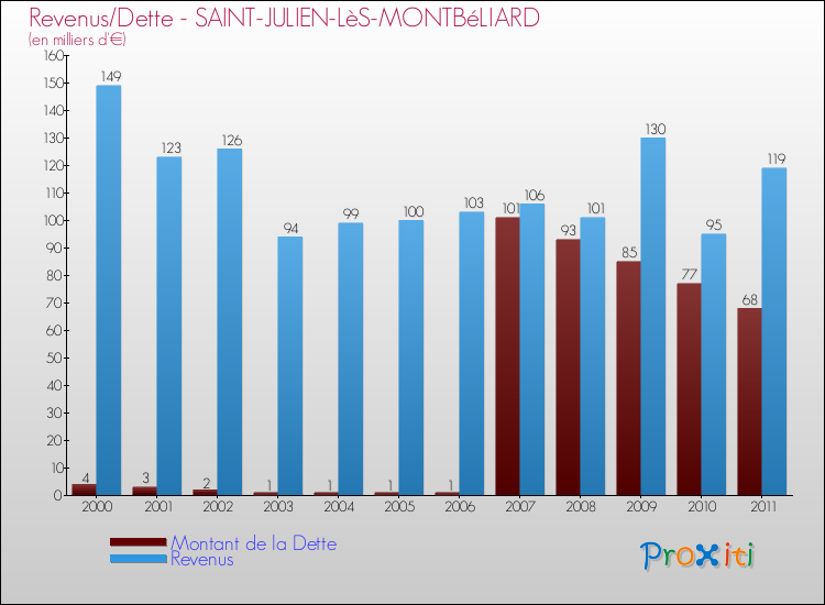 Comparaison Revenus/Dette de Saint-Julien-lès-Montbéliard (de 2000 à 2011)
