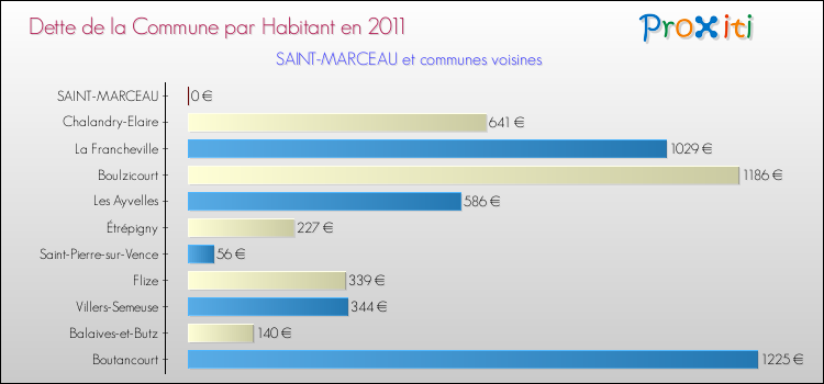 A noter : la valeur moyenne de la dette par habitant des communes françaises similaires à Saint-Marceau était de 523 € par habitant, en 2011.