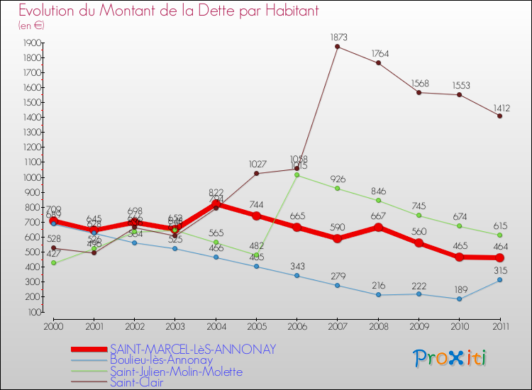 A Saint-Marcel-lès-Annonay, la dette par habitant a donc baissé de 34.56 % entre 2000 et 2011.