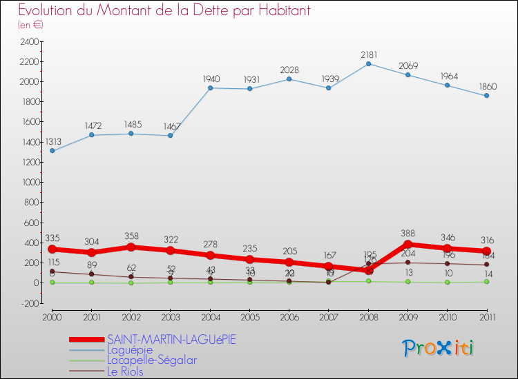 Pendant la même période, les communes françaises similaires à Saint-Martin-Laguépie, ont vu leur dette par habitant baisser de 2.96 % en moyenne entre 2000 et 2011.