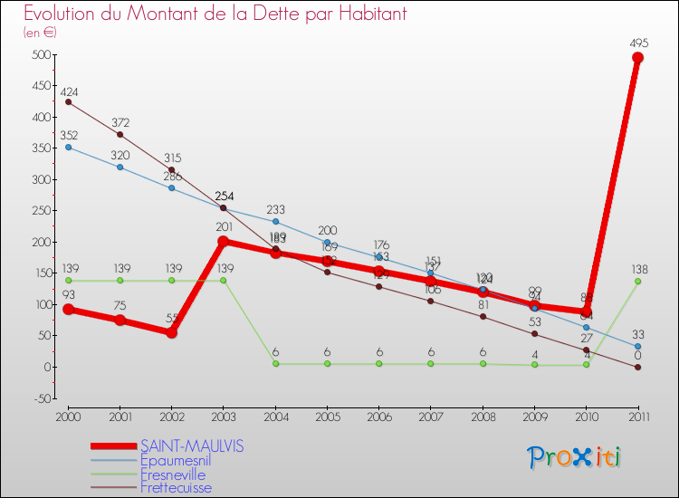A Saint-Maulvis, la dette par habitant a donc augmenté de 432.26 % entre 2000 et 2011.