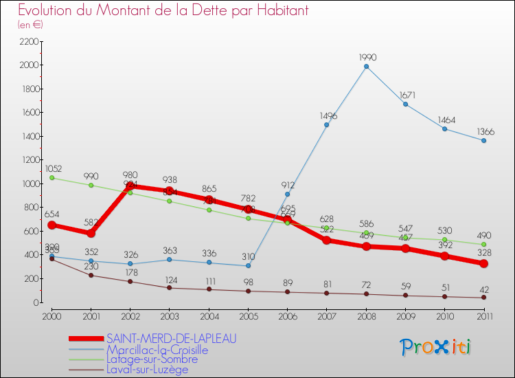 A Saint-Merd-de-Lapleau, la dette par habitant a donc baissé de 49.85 % entre 2000 et 2011.