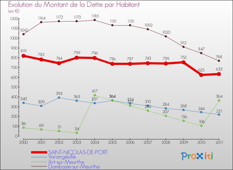 A Saint-Nicolas-de-Port, la dette par habitant a donc baissé de 22.71 % entre 2000 et 2011.