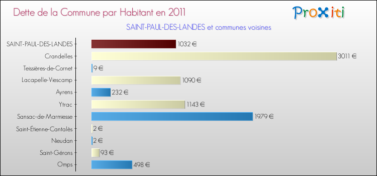 A Saint-Paul-des-Landes, la dette due par habitant de la commune en 2011 est donc plus élevée de 74.32 % que pour des communes similaires.