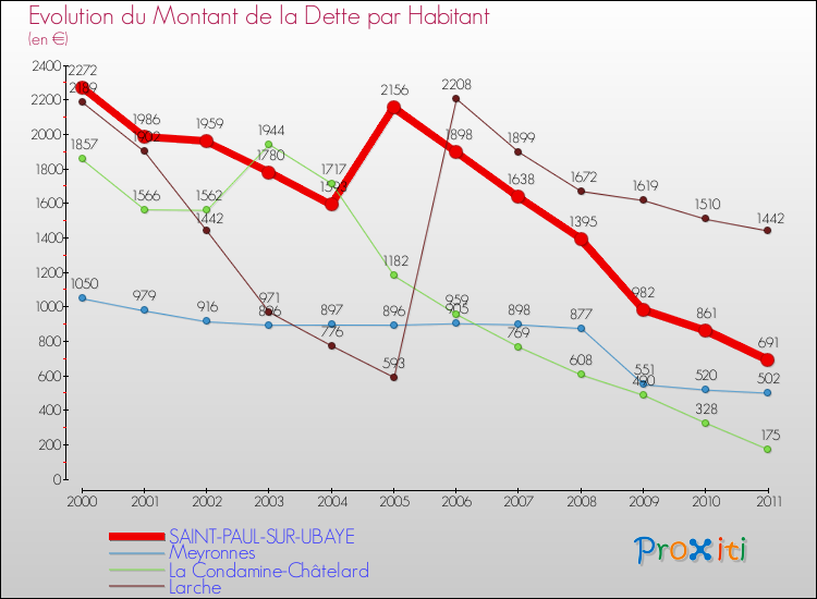 A Saint-Paul-sur-Ubaye, la dette par habitant a donc baissé de 69.59 % entre 2000 et 2011.