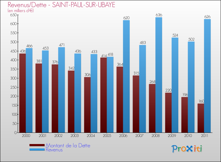 Comparaison Revenus/Dette de Saint-Paul-sur-Ubaye (de 2000 à 2011)