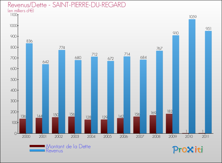 Comparaison Revenus/Dette de Saint-Pierre-du-Regard (de 2000 à 2011)