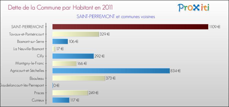 Pendant la même période, les communes françaises similaires à Saint-Pierremont, ont vu leur dette par habitant augmenter de 42.9 % en moyenne entre 2000 et 2011.