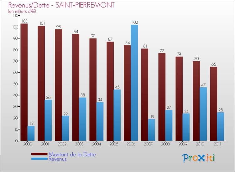 A Saint-Pierremont, la dette par habitant a donc baissé de 30.86 % entre 2000 et 2011.