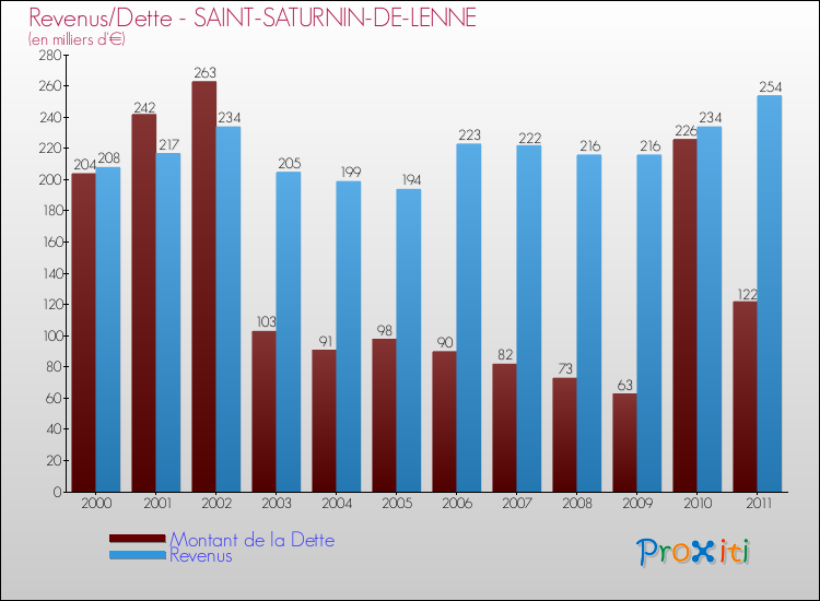 Comparaison Revenus/Dette de Saint-Saturnin-de-Lenne (de 2000 à 2011)