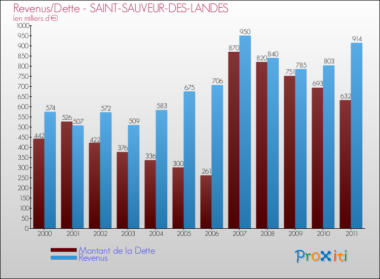 Comparaison Revenus/Dette de Saint-Sauveur-des-Landes (de 2000 à 2011)