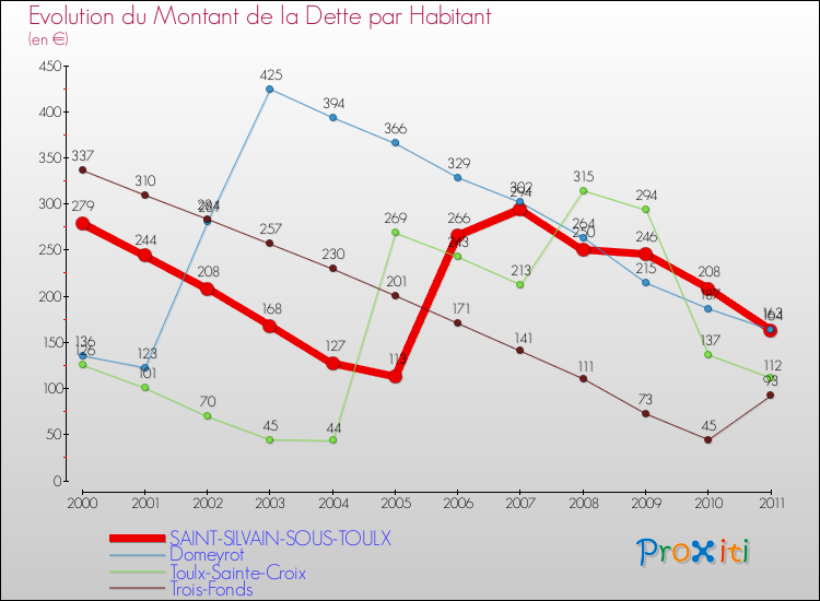 A Saint-Silvain-sous-Toulx, la dette par habitant a donc baissé de 41.58 % entre 2000 et 2011.