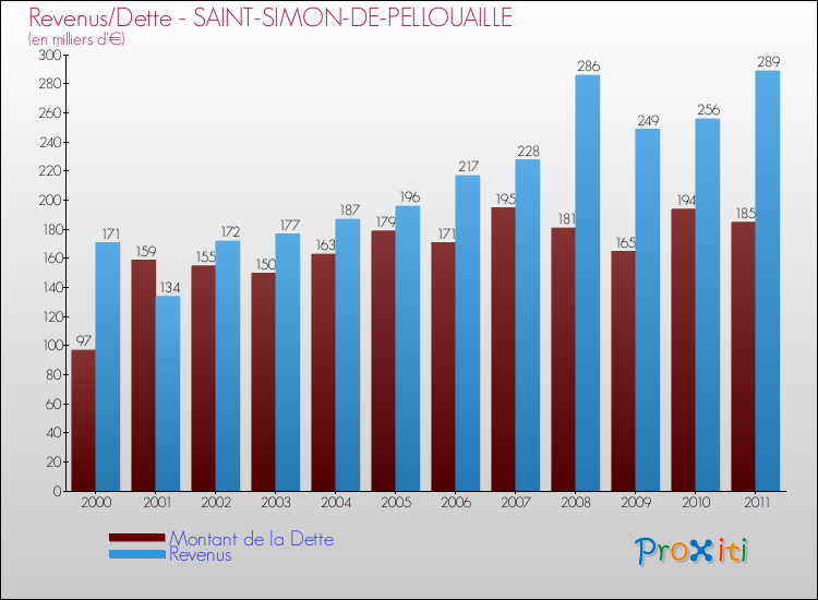Comparaison Revenus/Dette de Saint-Simon-de-Pellouaille (de 2000 à 2011)