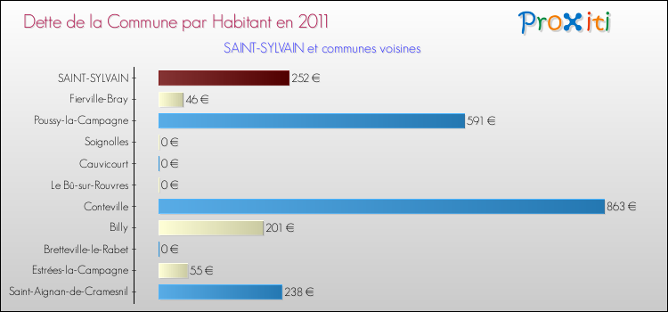 A Saint-Sylvain, la dette due par habitant de la commune en 2011 est donc moins élevée de 60.87 % que pour des communes similaires.