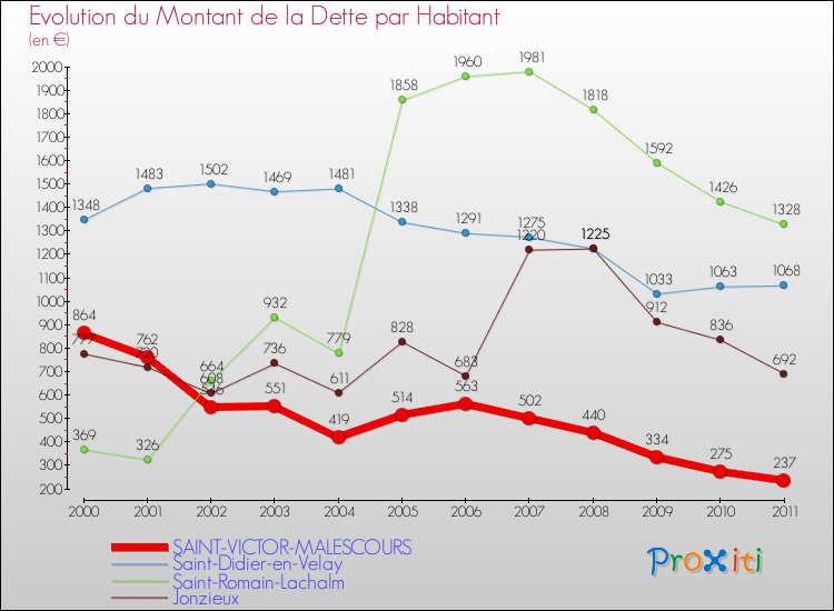 A Saint-Victor-Malescours, ce montant de la dette est pourtant en baisse de 15.79 % par rapport à 2010.