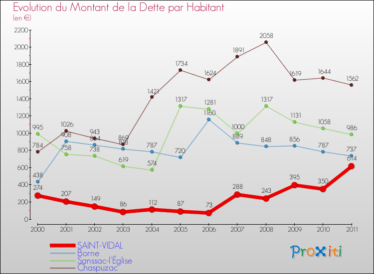 A Saint-Vidal, la dette par habitant a donc augmenté de 124.09 % entre 2000 et 2011.