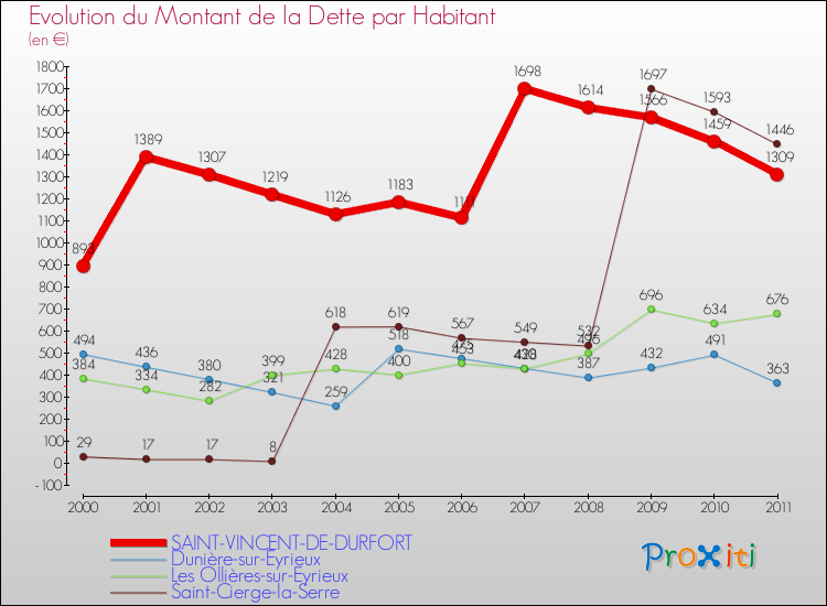 A Saint-Vincent-de-Durfort, la dette par habitant a donc augmenté de 46.58 % entre 2000 et 2011.