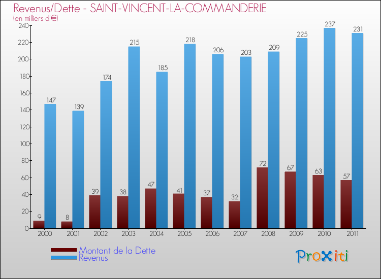 Comparaison Revenus/Dette de Saint-Vincent-la-Commanderie (de 2000 à 2011)