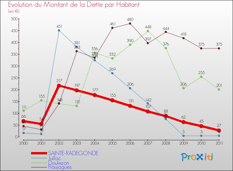 A Sainte-Radegonde, la dette par habitant a donc baissé de 59.09 % entre 2000 et 2011.