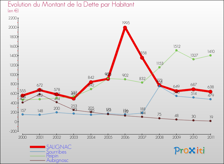 A Salignac, la dette par habitant a donc augmenté de 14.95 % entre 2000 et 2011.