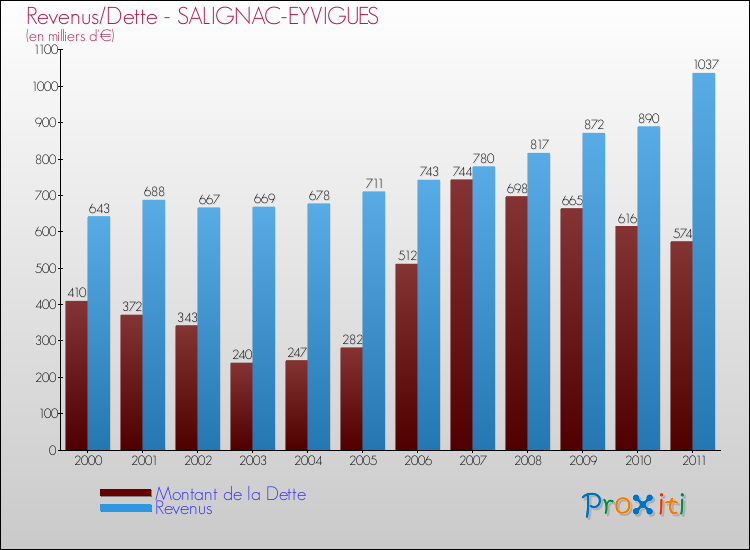 Comparaison Revenus/Dette de Salignac-Eyvigues (de 2000 à 2011)