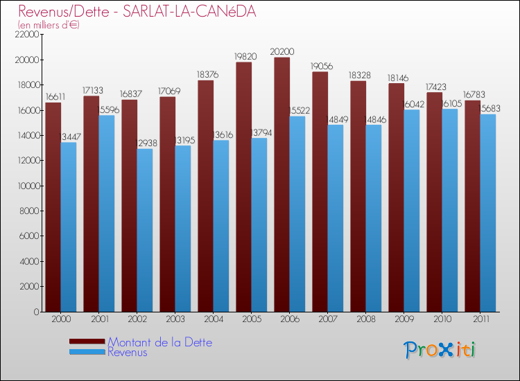 Comparaison Revenus/Dette de Sarlat-la-Canéda (de 2000 à 2011)