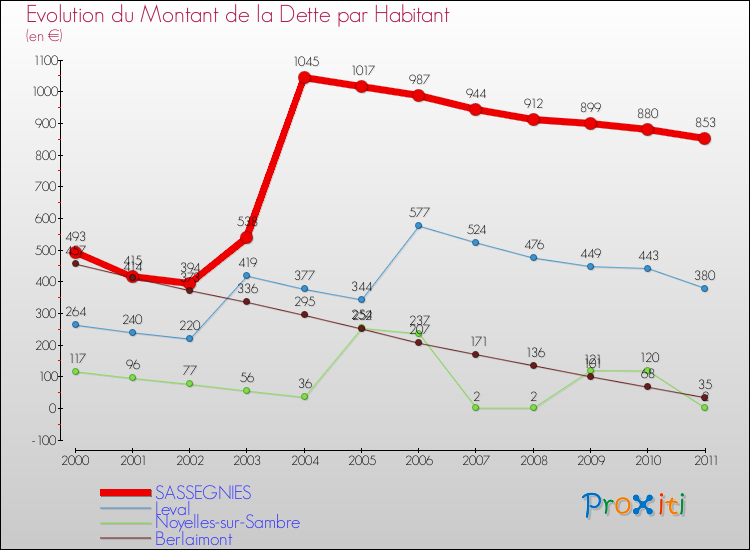 Par rapport aux 281 habitants de Sassegnies, en 2011 le poids de cette dette représente 853 € par habitant.
