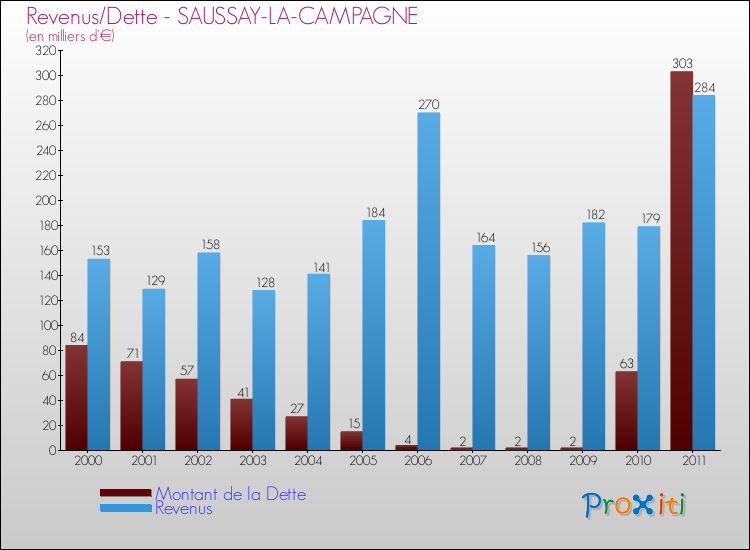 Comparaison Revenus/Dette de Saussay-la-Campagne (de 2000 à 2011)