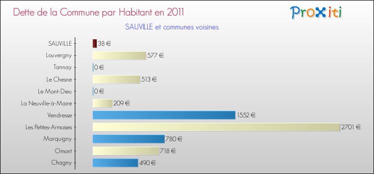 A noter : la valeur moyenne de la dette par habitant des communes françaises similaires à Sauville était de 523 € par habitant, en 2011.