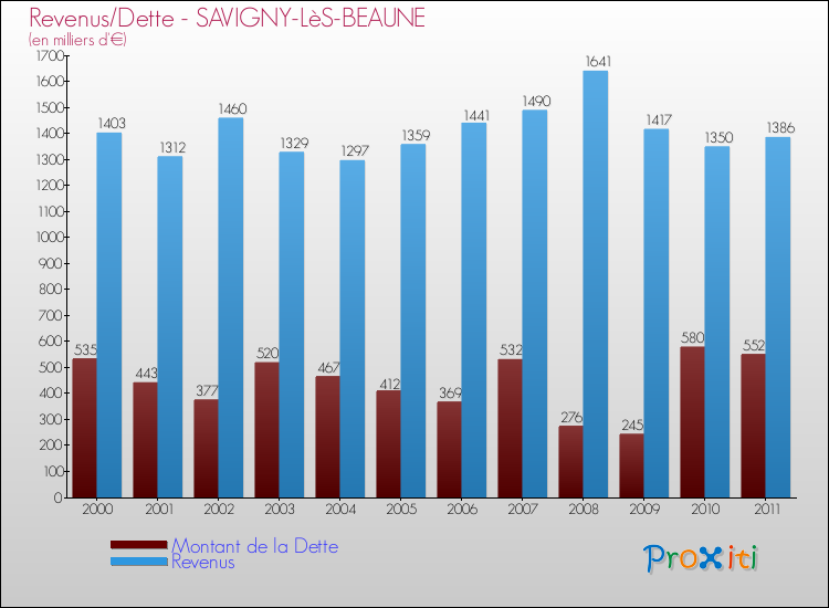 Comparaison Revenus/Dette de Savigny-lès-Beaune (de 2000 à 2011)