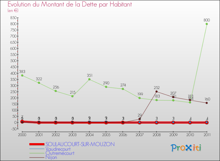 Pendant la même période, les communes françaises similaires à Soulaucourt-sur-Mouzon, ont vu leur dette par habitant augmenter de 24.08 % en moyenne entre 2000 et 2011.