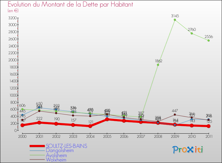Par rapport aux 894 habitants de Soultz-les-Bains, en 2011 le poids de cette dette représente 125 € par habitant.