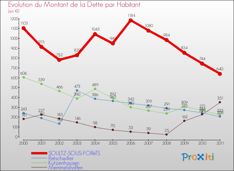 Par rapport aux 2 930 habitants de Soultz-sous-Forêts, en 2011 le poids de cette dette représente 640 € par habitant.