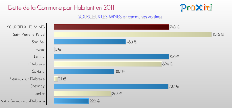 A noter : la valeur moyenne de la dette par habitant des communes françaises similaires à Sourcieux-les-Mines était de 592 € par habitant, en 2011.