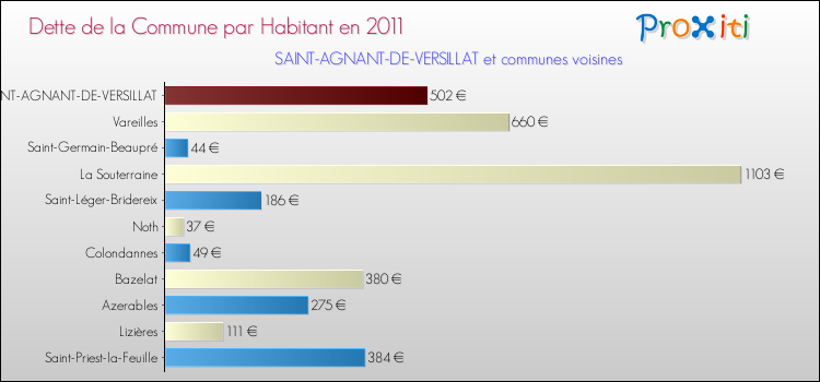 A noter : la valeur moyenne de la dette par habitant des communes françaises similaires à Saint-Agnant-de-Versillat était de 592 € par habitant, en 2011.