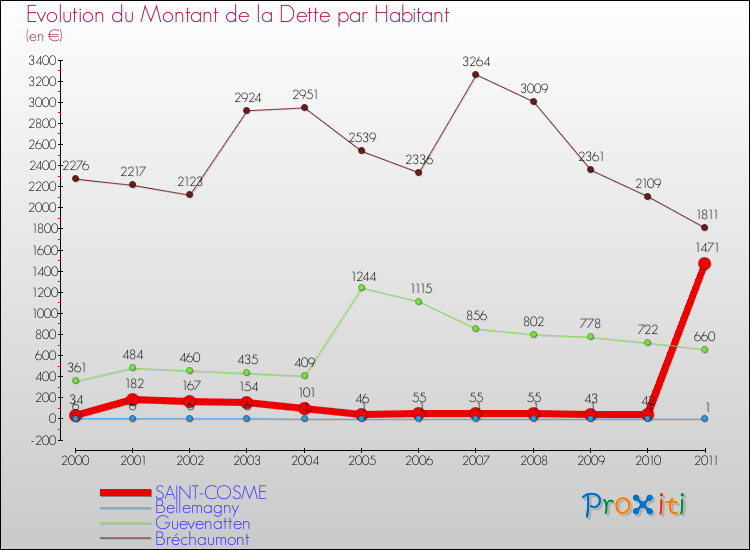 A Saint-Cosme, la dette par habitant a donc augmenté de 4226.47 % entre 2000 et 2011.