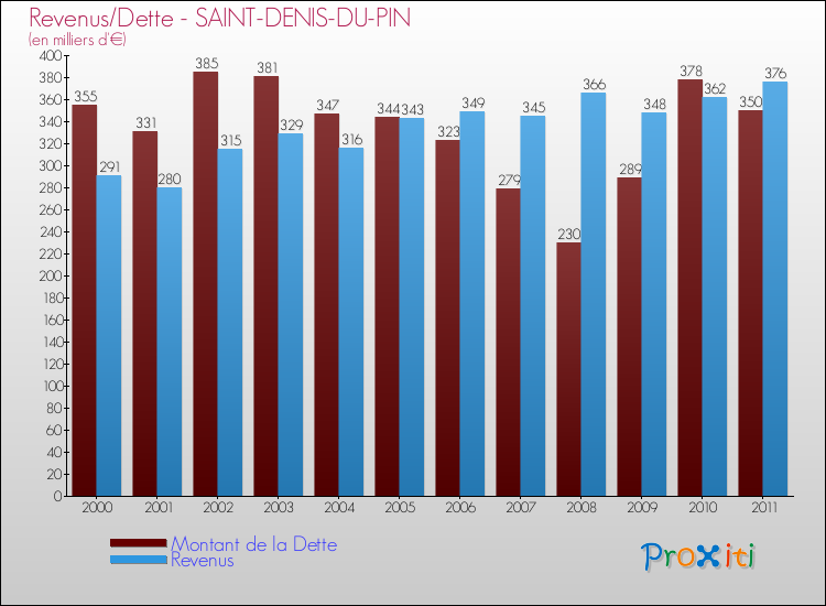 Comparaison Revenus/Dette de Saint-Denis-du-Pin (de 2000 à 2011)