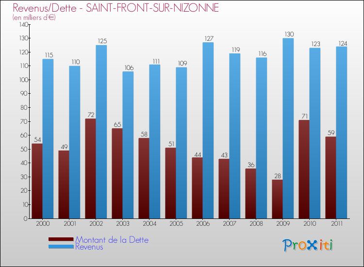 Comparaison Revenus/Dette de Saint-Front-sur-Nizonne (de 2000 à 2011)