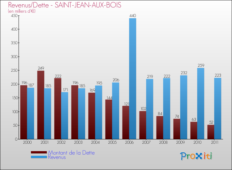 Comparaison Revenus/Dette de Saint-Jean-aux-Bois (de 2000 à 2011)