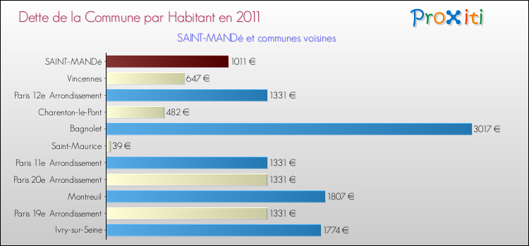 Par rapport aux 22 771 habitants de Saint-Mandé, en 2011 le poids de cette dette représente 1011 € par habitant.