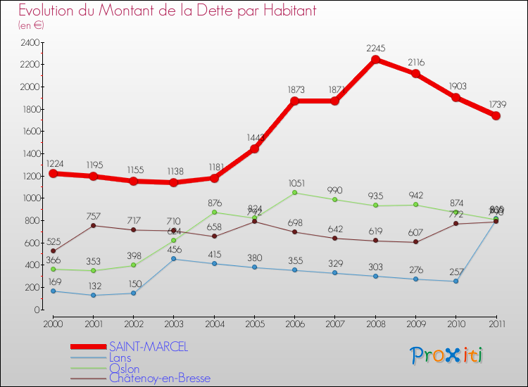 A Saint-Marcel, la dette par habitant a donc augmenté de 42.08 % entre 2000 et 2011.