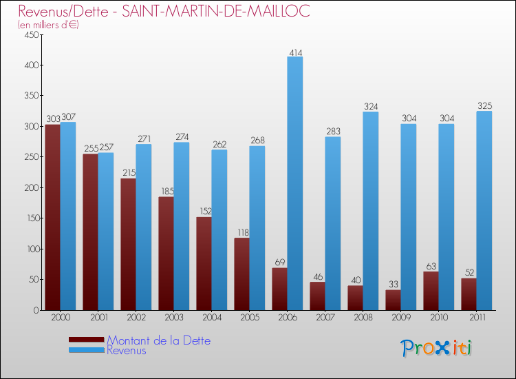 Comparaison Revenus/Dette de Saint-Martin-de-Mailloc (de 2000 à 2011)