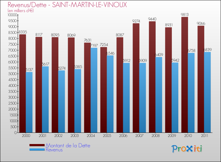Comparaison Revenus/Dette de Saint-Martin-le-Vinoux (de 2000 à 2011)