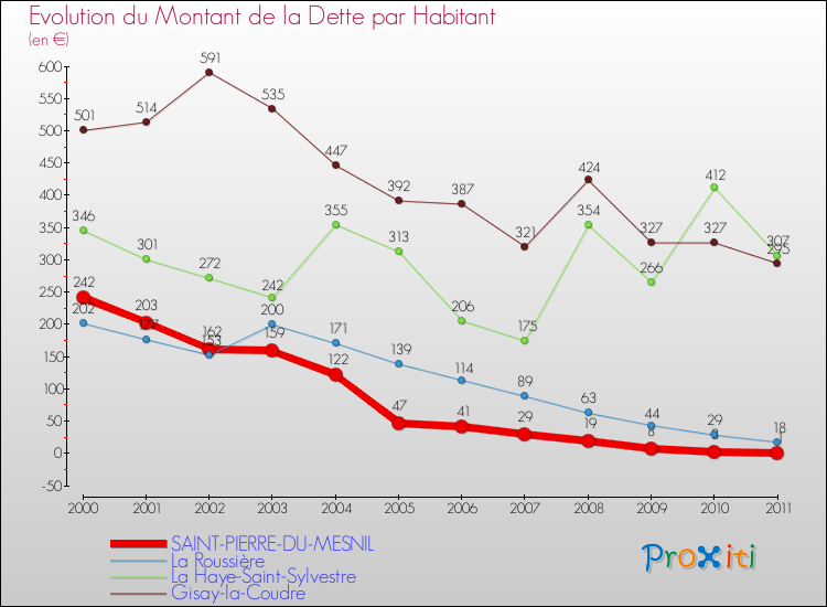 A Saint-Pierre-du-Mesnil, la dette par habitant a donc baissé de 99.59 % entre 2000 et 2011.