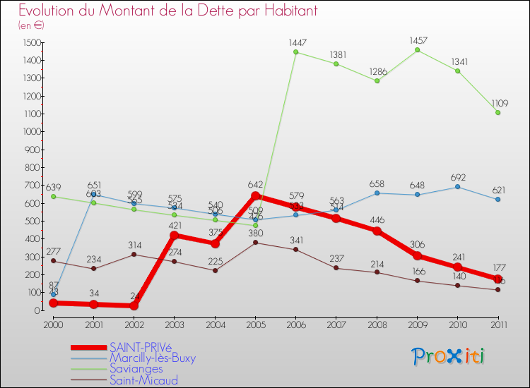 Pendant la même période, les communes françaises similaires à Saint-Privé, ont vu leur dette par habitant augmenter de 23.59 % en moyenne entre 2000 et 2011.