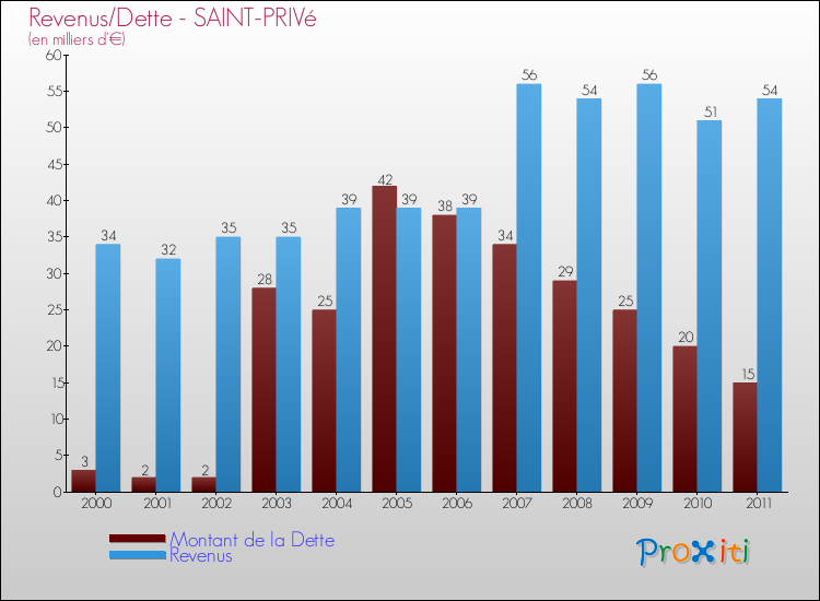Comparaison Revenus/Dette de Saint-Privé (de 2000 à 2011)