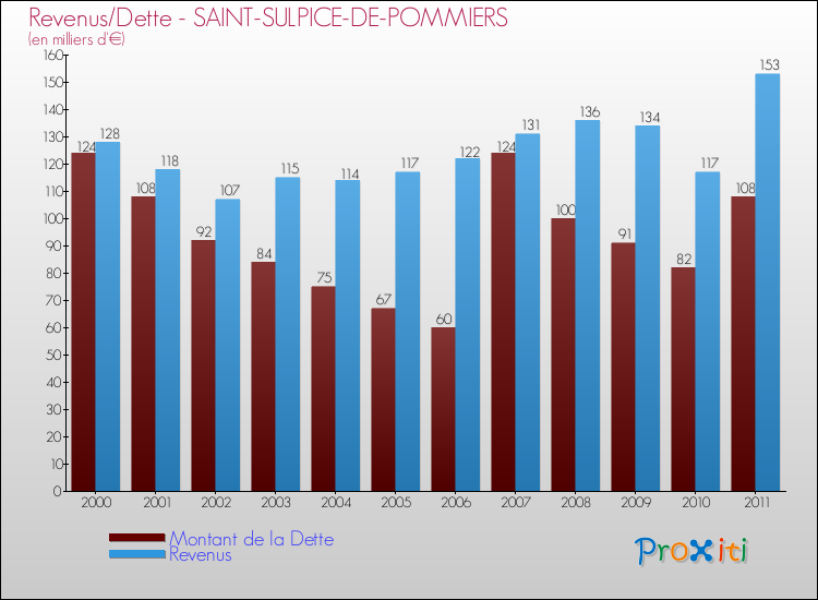 Comparaison Revenus/Dette de Saint-Sulpice-de-Pommiers (de 2000 à 2011)